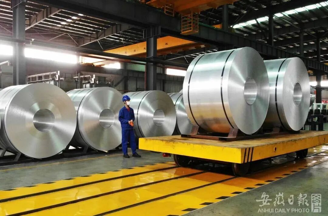 ? 5月1日,淮北市濉溪縣經濟開發區鋁基新材料基地,高精鋁板企業正在忙著生產。李鑫/攝